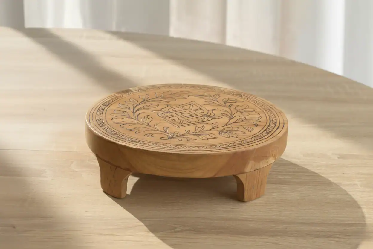 Le veinage et la couleur du bois dialoguent avec le motif floral, rendant chaque présentoir absolument unique. Protégé par une huile naturelle, il conserve sa chaleur et sa durabilité au fil du temps.