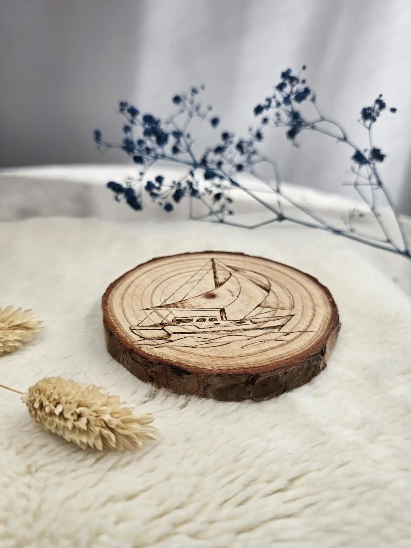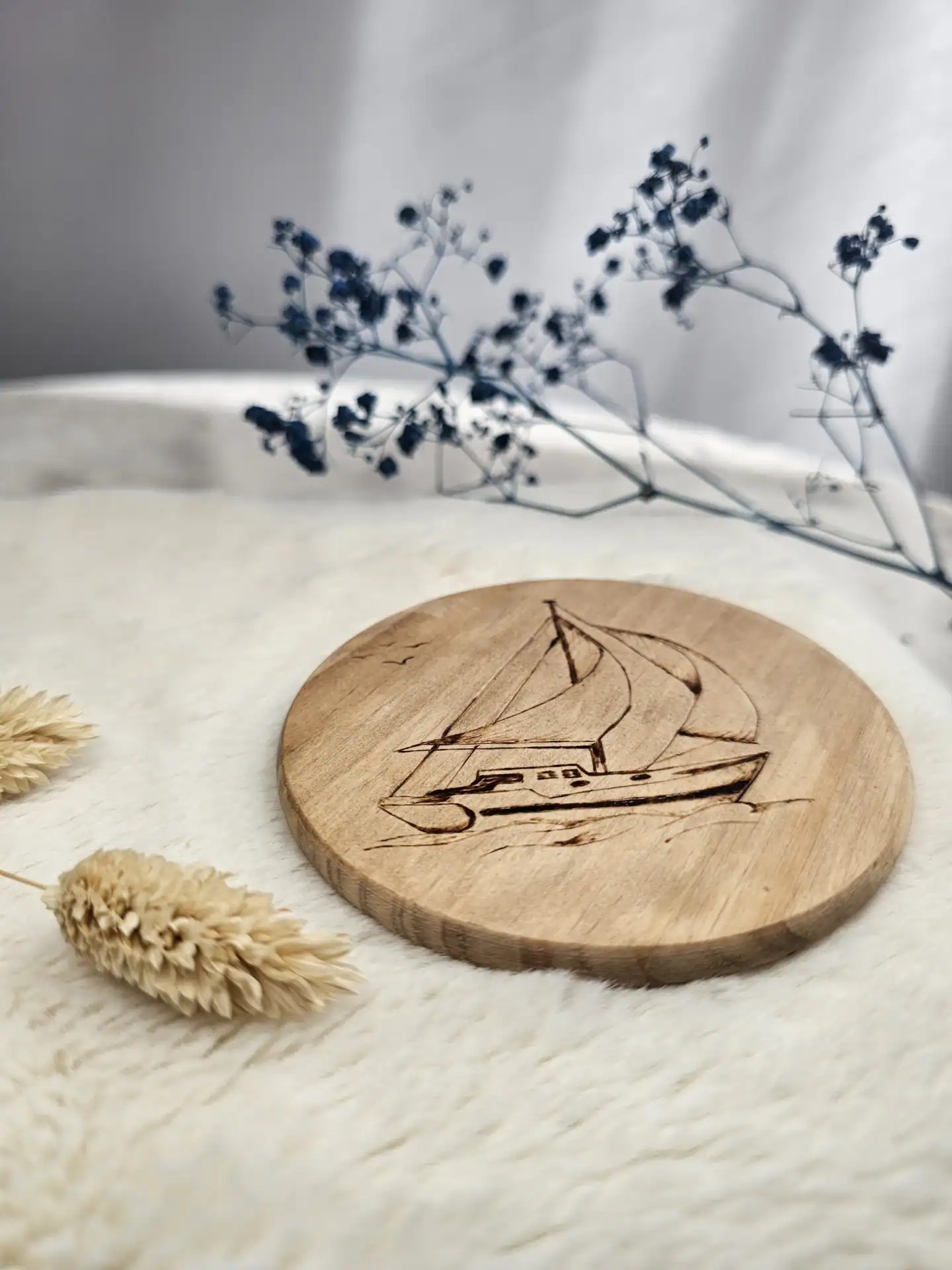 Chaque dessous de verre est dessiné et pyrogravé à la main, puis protégé par un vernis marin qui assure sa résistance au quotidien tout en mettant en valeur le veinage du bois.