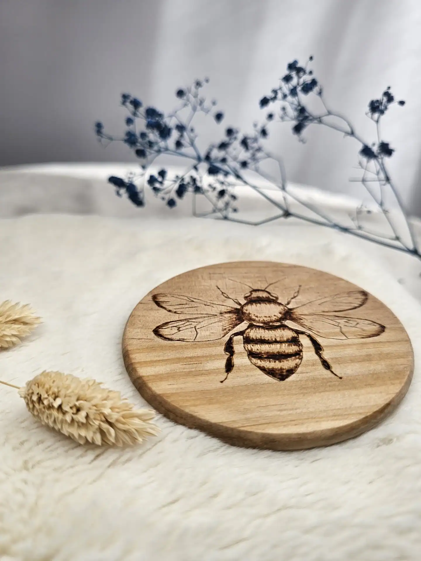 Chaque dessous est dessiné et pyrogravé à la main, puis protégée par un vernis marin révélant la texture naturelle du bois. Un objet sensible, à la fois utile et porteur de sens.