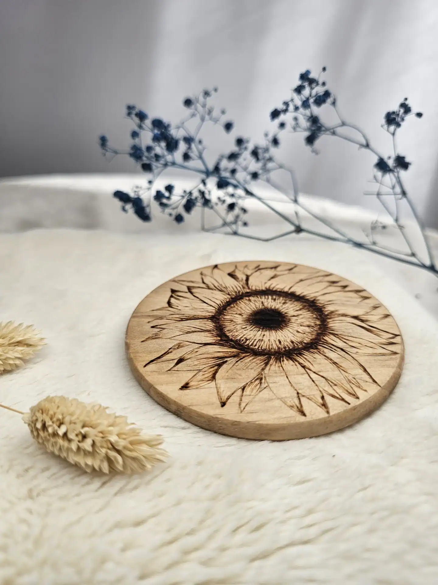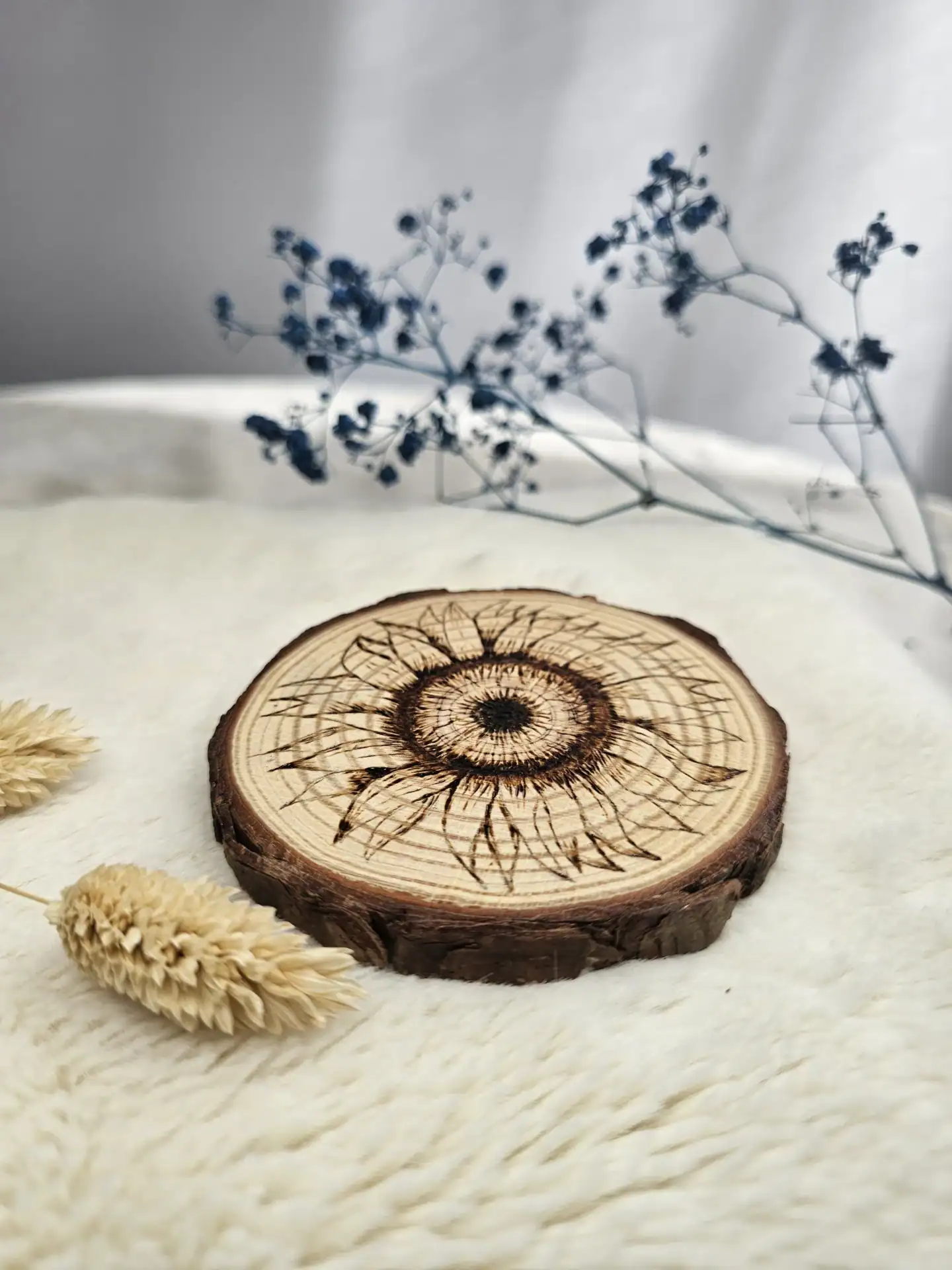 Chaque dessous de verre est dessiné et pyrogravé à la main, puis protégée par un vernis marin qui révèle la chaleur du bois et garantit sa durabilité. Un objet lumineux pour accompagner les instants du quotidien.